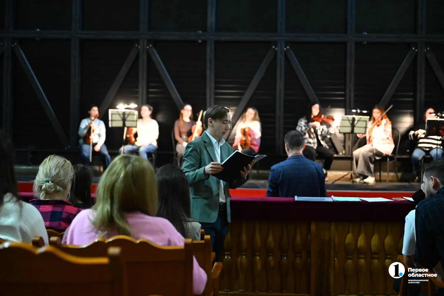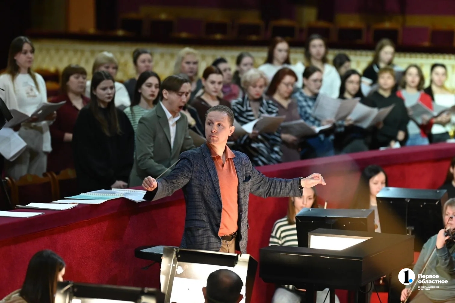 Хор — на зрительских местах, музыканты — в оркестровой яме. Это пока, на репетиции, певцы сидят в зале, ведь прямо в этот момент за железным занавесом монтируют декорации для сегодняшней оперы «Аида». А уже в субботу все артисты поднимутся на сцену, чтобы представить совершенно новую для Челябинска программу.