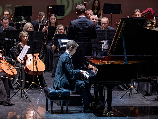 Солистами Концерта для фортепиано, трубы и струнного оркестра стали Дмитрий Каукин (фортепиано) и Илья Лушников (труба). Искрометный триумвират фортепиано, трубы и оркестра полон цитат, стилизаций и музыкальных улыбок. Пианист Дмитрий Каукин, которого коллеги еще несколько лет назад называли «нашим Ваном Клиберном», вышел на новый уровень мастерства.